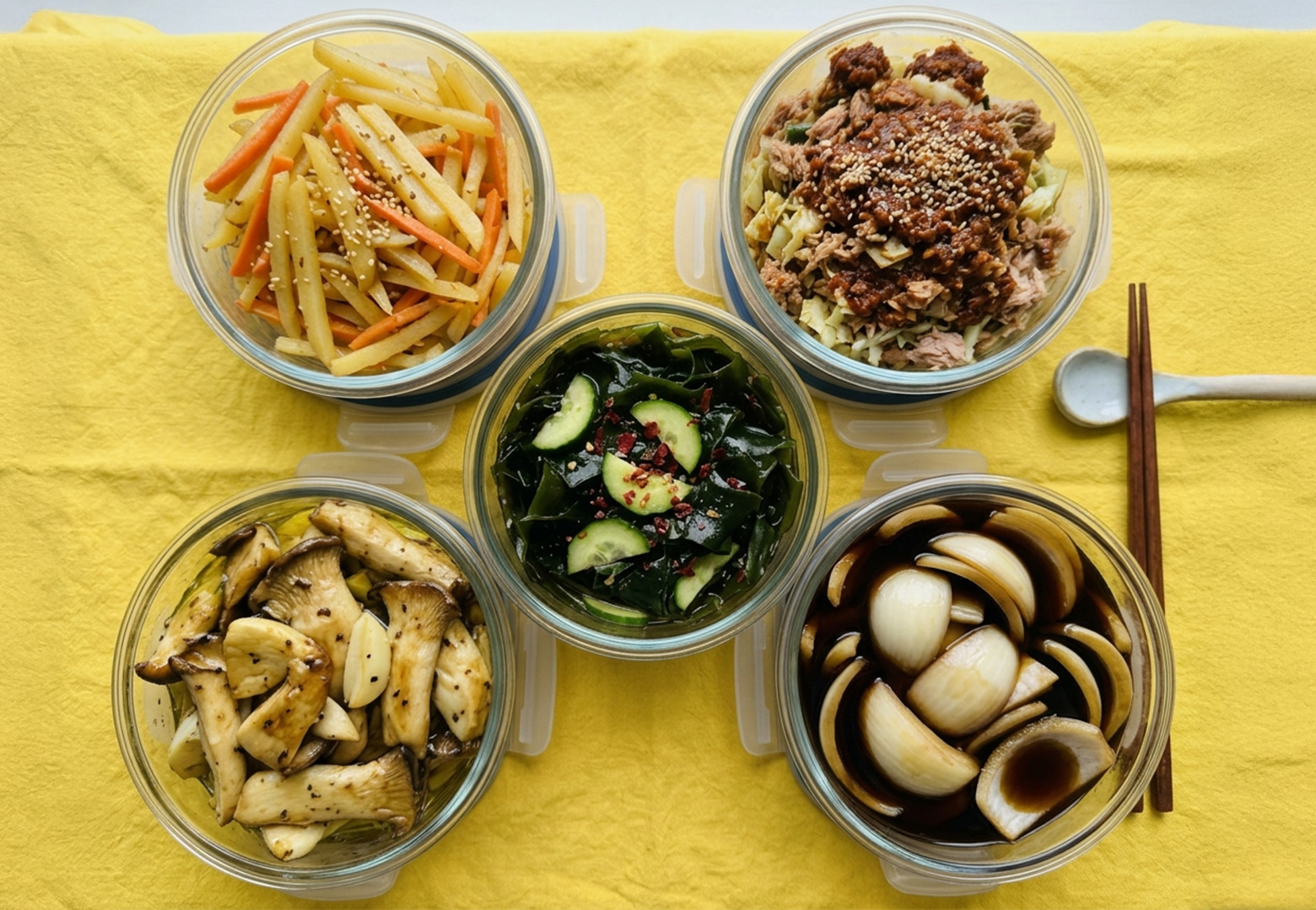 주말 1~2시간 투자해서 5종을 한꺼번에 만들어두면 평일 내내 꺼내 먹을 수 있어요. 양파 장아찌부터 시작해서 버섯 마리네이드, 감자채 볶음 순서로 만들면 효율적이에요.
