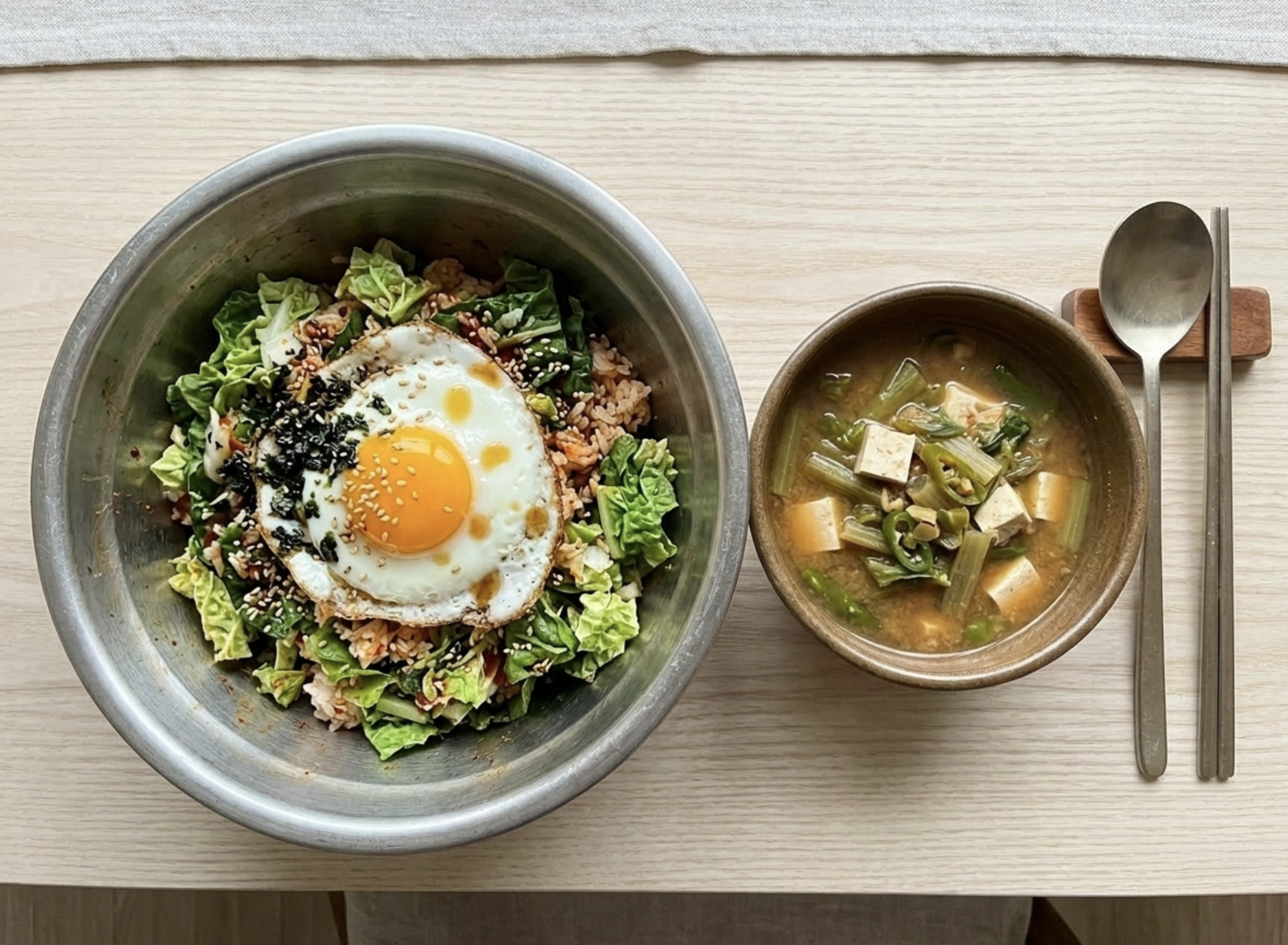 4단계 — 달걀 프라이 & 완성 달걀은 반숙으로 프라이해줘요. 밥 위에 버무린 봄동을 올리고, 달걀 프라이 얹고, 마지막에 들기름 한 큰술 두르면 완성이에요. 참기름보다 들기름이 훨씬 고소하고 봄동이랑 잘 어울려요!